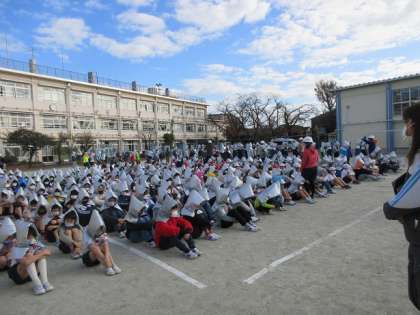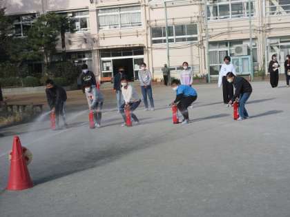 今日は、高学年の代表の子ども達が、消火器を使用した模擬訓練を行いました。