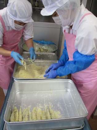 写真はししゃもにパン粉をつけているところです。サクッと揚ったししゃもがおいしかったからもう一度出してください、と1年生からリクエストをもらいました。