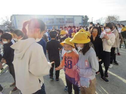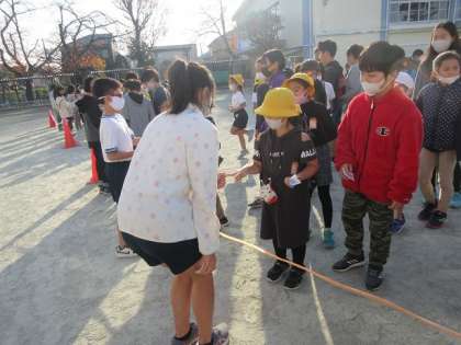 前に並んだ集会委員の56年生とジャンケンで勝つとクリスマスにちなんだカードがもらえました。全部のカードをもらえたでしょうか?