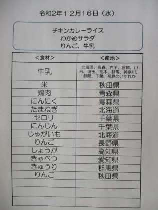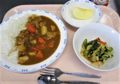 給食のカレーはルウから作り、スープは鶏ガラからとっています。今日もおいしくできました。デザートはリンゴです。「1日1個のりんごは医者いらず」ということわざがあります。旬のりんごを食べて病気にかからないからだをつくりましょう。