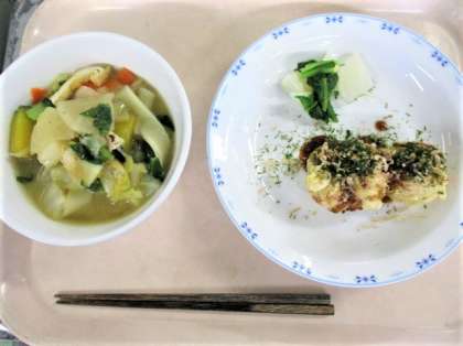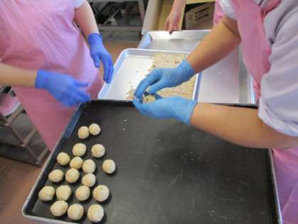 かぼちゃはほうとうに、ゆずは絞り汁と皮の千切りがかぶのサラダに使われています。たこあげ風はたこ焼きのような見た目にサンプルケースをのぞいた子供達は大喜びしていました。「おいしかった!」ととても好評でした。写真はたこ焼き風を作っているところです。じゃがいもを蒸してつぶした生地にたこを入れて丸めているところです。この後、衣をつけて油で揚げます。