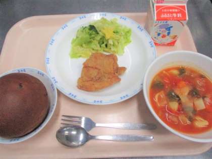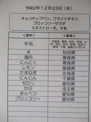 今日で2学期の給食は最後です。クリスマスには少し早いですが、クリスマスの食事をイメージした献立です。ブロッコリーサラダには星形のかまぼこが入っています。献立表を見て、朝からこどもたちは楽しみにしてくれていました。3学期も心と体の栄養になるおいしい給食を作りますので、楽しみにしていてください。