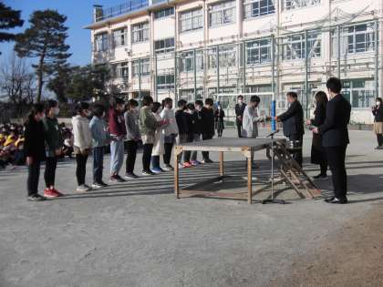 2学期の終業式が行われました。良い天気に恵まれ青空の下で、皆凛々しい顔で臨んでいました。