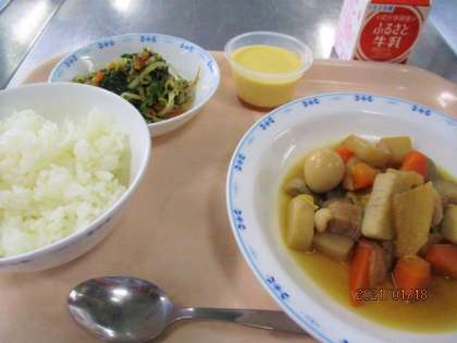 今週は読書週間に合わせて、図書コラボメニューを作ります。今日は「ぷりんちゃんとモンブランばあば」という絵本をイメージしたデザートを作りました。給食室でカラメルソースから手作りしています。牛乳のかわりに豆乳を使った豆乳プリンです。なめらかな蒸しプリンができました。