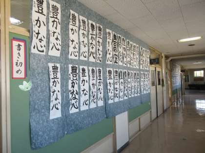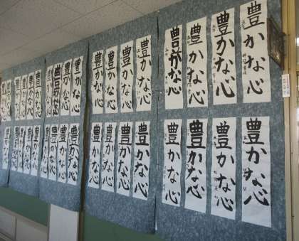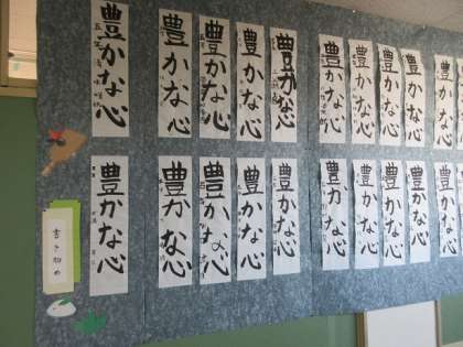 5年生の書いた「豊」は、気が付くと縦に長くなってしまいがちな字です。そうすると最後まで字が入らなくなり「心」が小さくなってしまいます。はじめの「曲」になる、一画目が長くならないことが、書き出しのポイントです。