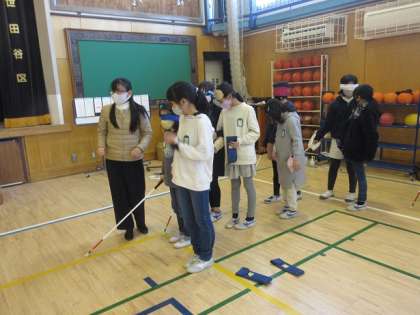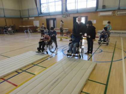 車椅子の押し方や、目の不自由な方へのサポートの仕方を体験しました。