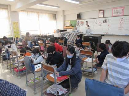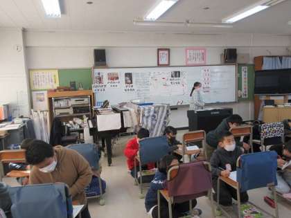 音楽室に行くと、子ども達がみんな後ろ向きで座っていました。
