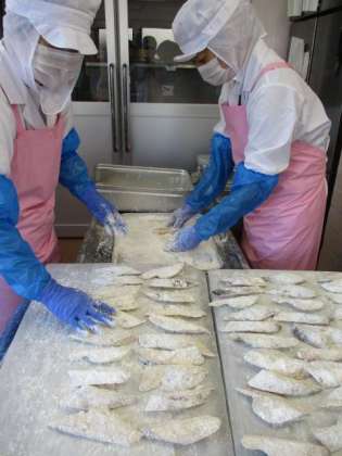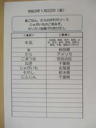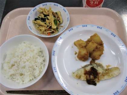 読書週間に合わせたお話給食は毎日こどもたちが楽しみにしてくれています。給食を食べてその本に興味を持ってくれたり、本を読んで給食を楽しみにしてくれたりしています。今日のお話給食は「たらが大発生したら」という本からイメージした「たらの変わりソースがけ」です。たらに衣をつけてカリッと揚げた後、ウスターソースをつかったネギソースをかけています。