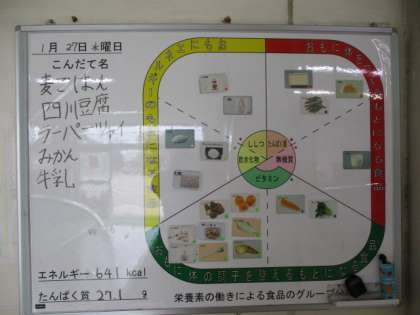 今日のくだものはみかんです。最近の研究で、みかんにはビタミンCなどの栄養成分が多くふくまれています。近年の研究で、みかんの色素には、生活習慣病を防いだり、骨の健康に役立ったりする働きがあることも解明されてきました。皮をむくだけで手軽に食べられる旬のみかんを食べて元気に冬をすごしましょう。写真は保健給食委員の活動として、児童が毎日記入している栄養黒板です。