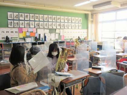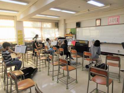 5年生の教室や音楽室だけでなく、ランチルームなども使い、一部屋あたりの人数んを減らし、並び方や吹く方向にも注意しながら練習しています。