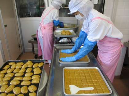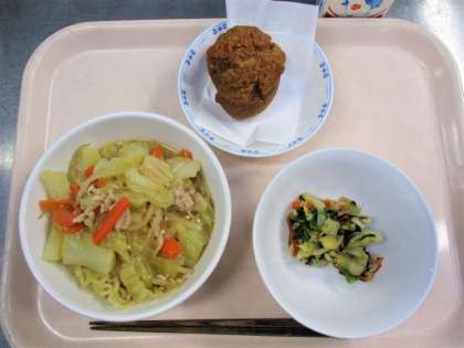 今日の味噌ラーメンとサーターアンダギーはリクエスト給食です。給食リクエストボックスには毎日お手紙が届きます。「今日の給食おいしかったです。」「〇〇がもう一度食べたいです。」「いつもおいしい給食をありがとうございます。」などが書いてあります。このようなお手紙をもらうと、とてもうれしく、はげみになります。写真はサーターアンダギーを作っているところです。