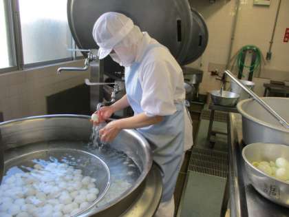 たまごトーストのたまごはゆでたまごを約300個作り、マヨネーズとたまねぎを合わせて作りました。写真はゆでたまごの殻をむいている様子です。