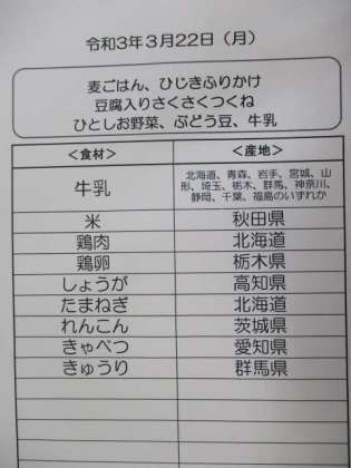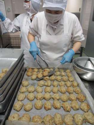 今日は鶏ひき肉でつくねを作りました。上からあんをかけています。ごはんを中心に、肉、野菜、豆、海藻、牛乳がそろった栄養バランスのよい食事です。ぶどう豆は乾燥大豆を朝からもどして作りました。甘く煮た大豆です。ふっくらとよく煮えていてとてもおいしくできました。今年度の給食も今日を入れてあと二日です。最後まで安全でおいしい給食の提供につとめていきます。