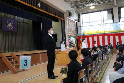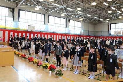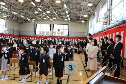 担任の先生やお世話になる先生方の発表です。「1年生の皆さん、立ちましょう。」という司会の副校長先生の言葉に、しっかり立てる1年生です。お話をよく聞いているということです。