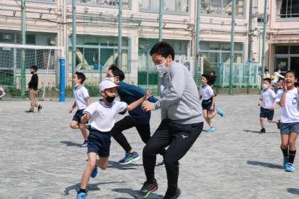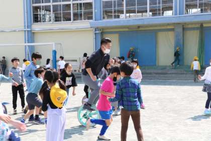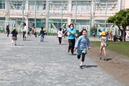 先生も一緒に遊んでいます。本校では先生たちに「共遊び」を推奨しています。一緒に遊ぶことを通して子どもの理解や仲間づくりにつながります。