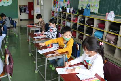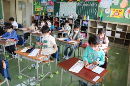 1年生の様子です。今日は、初めて自分の名前を書きました。「まだひらがなのお勉強していないから自分の名前がわからなくていいんですよ。机の上に、先生が心をこめて書いた名前があるからそれを真似して書いてね。」という先生の言葉に、安心して取り組めました。