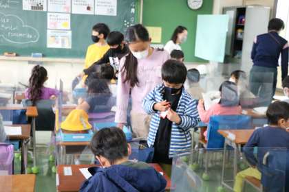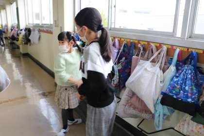 すぐにやってあげるのでなく、まずは見守る6年生です。1年生の、やってみよう!という気持ちを大切にしてくれます。