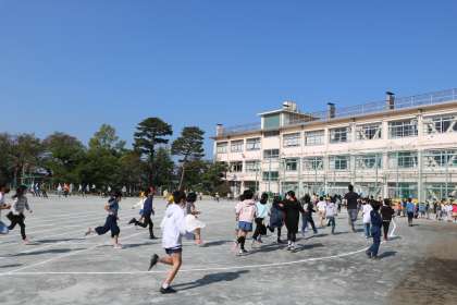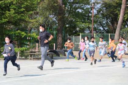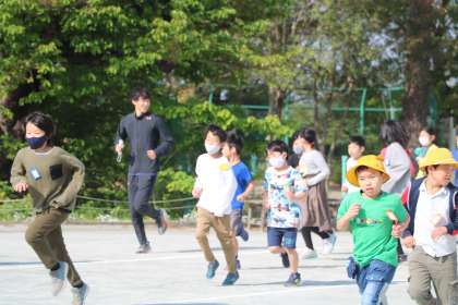 砧小学校は、授業前に体を動かし脳の活性化を図り、学習に集中して取り組む…ことをねらいとして、朝遊びの最後に「ランランラン」に取り組んでいます。感染症対策の観点から今年度は、朝は半分の3学年、中休みの最後にもう半分の3学年が走ることにしました。
