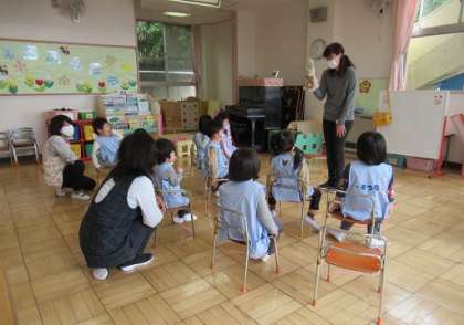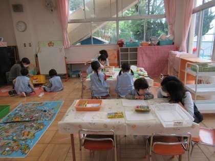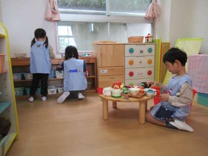 今日は雨。保育室にある遊具を使ったりお絵かきをしたりして遊びました。遊んだ後は片付けて、みんなで一緒に手遊びを楽しみました。