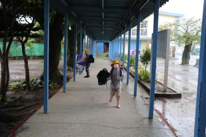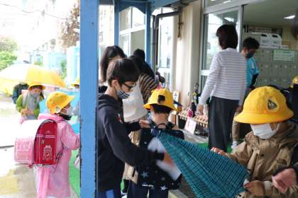 きれいな雑巾を準備して、濡れたランドセルを拭いてくれる6年生。よく気が付きます!