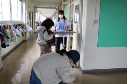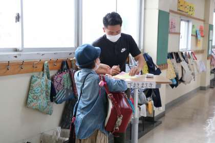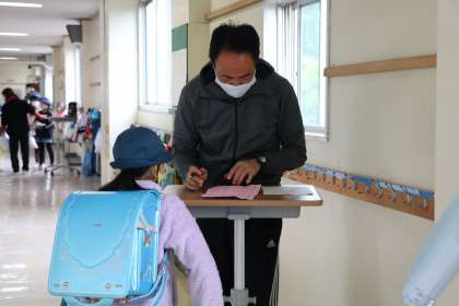 砧小学校では、「感染症は入口で防ぐ」を合言葉に、教室に入る前に健康観察カードをチェックします。教室には消毒用アルコールスプレーとジェルタイプのものも置いてあります。