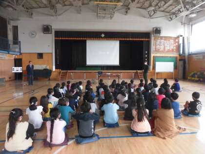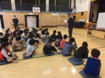 今日は1・2・3年生のセイフティー教室です。所管の警察署である成城警察署のスクールサポーターの方を講師にお迎えして、お話をしていただきます。世田谷区の取り組みで、砧小学校では1・2・3年生に毎年1回行っています。テーマは学年に応じて変えています。1・2年生には繰り返しの内容もありますが、自分の安全を守る大切な話なので何回でも聞いて、忘れずに行動できるようになってほしいと思います。
