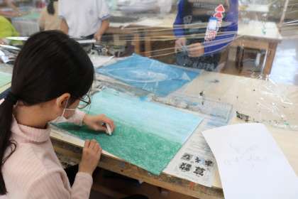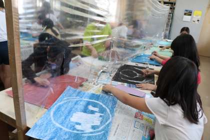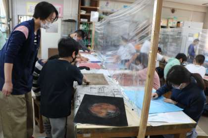 「イノチノカタチ」というテーマの作品です。自分のイメージする生命(イノチ)のカタチを形や色で表しています。