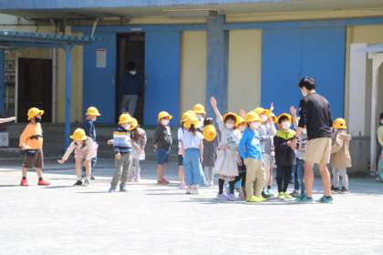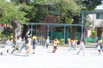 島おにをしています。先生も真剣に遊んでいて滑ってしまいました。先生大丈夫?