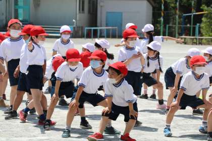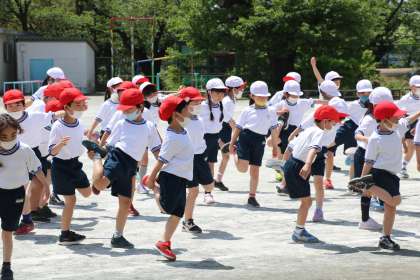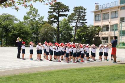 初めに、体育の身なりを整え確認してから、音楽に合わせて準備運動です。今日は、鬼遊びをしながら、校庭を思う存分走り回りました。