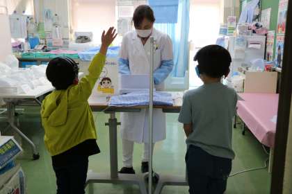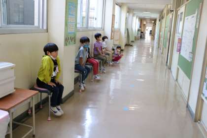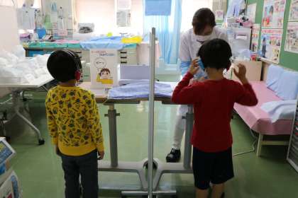 保健室前の廊下では1年生が静かに順番を待っています。保健室で聴力検査をやっています。先生の説明をしっかり聞いて、聞こえたら黙って手をあげます。隣の人と違う音が流れているので、隣の人が手をあげても気にしないで集中します。