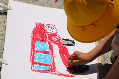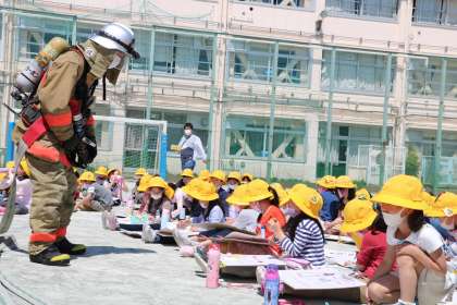 なかには消防服を着てモデルになってくださっている消防隊員の方とお話している子もいます。暑い中、ありがとうございます。