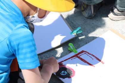 「しっかり塗れてて、すてきな作品だね」などと担任の先生とお話しながら。