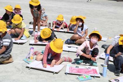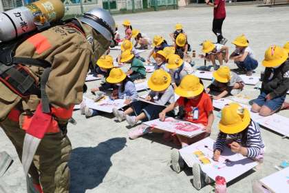 続きは教室でも描きます。間近に迫る消防自動車を見ながらじっくり絵を描くことができました。