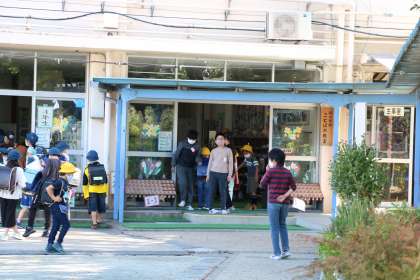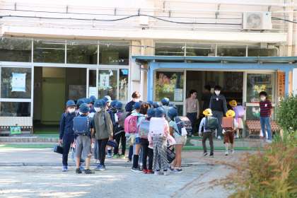 今日の午後は、世田谷区内小学校の先生たちの研修日です。そのため子ども達は4時間で下校です。朝の登校時間に正門に立っていると