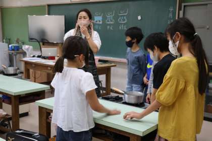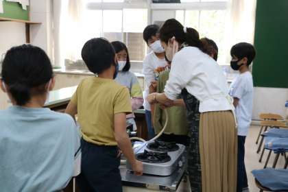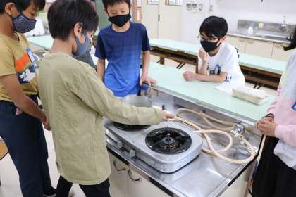 ガスコンロの使い方を学習しています。ガスのホースにひびが入っていないか、ガス器具の元栓の開閉のしかたなど、安全に調理をするための大切なことばかりです。