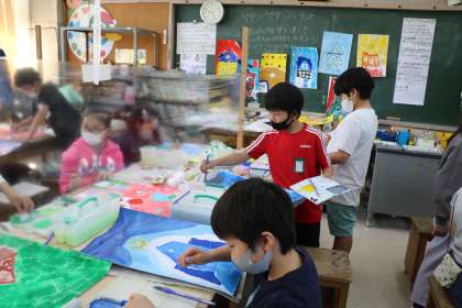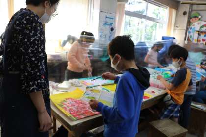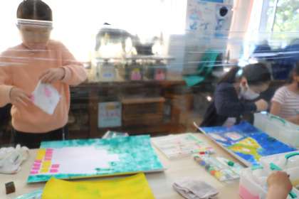 「ペタンペタンハウス」という作品制作の様子です。名前だけ聞いても楽しそうです。いろいろな素材でスタンピングをして背景やハウスを仕上げていきます。楽しそう!と思いながら見ていたら「なんかこの感じ、おいしそうじゃない?」とお隣の友達に見せています。確かに!いろいろな素材の持ち味でお菓子のような仕上がりにもなります。