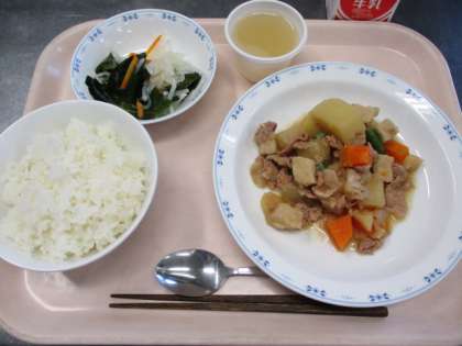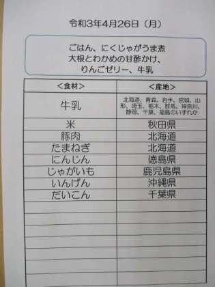 給食で初めて出たゼリーのデザートに1年生は興味津々でした。給食は、ゼリーやケーキなどのデザートもすべて素材から手作りしています。