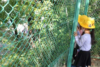 フェンス越しに下の砧幼稚園の園庭を見ると、先生たちがこいのぼりを出しています。