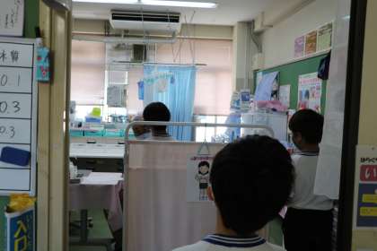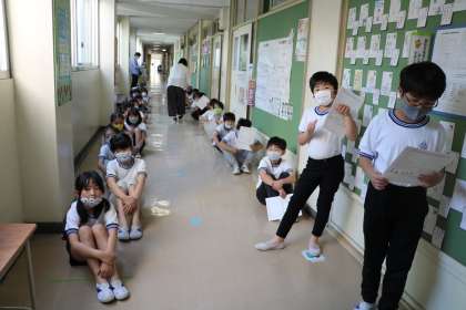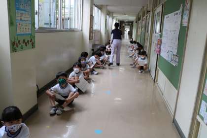 今日は1・2・4年生の内科検診がありました。職員室から廊下に出てビックリです。保健室から職員室前まで、ソーシャルディスタンスを取りながら、一言もお喋りをせず並んで待っている子たちが!誰もいないかと思うくらい静かだったのでびっくりしたのです。「さすがきぬたの2年生!」と言ったら、列の前の方は1年生ではありませんか。お兄さんお姉さんをお手本に、1年生も立派です。
