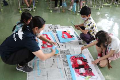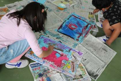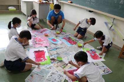 1年生図工授業の様子です。内科検診と並行して授業をしているので、絵具での仕上げも順番に。先生にアドバイスしてもらいながら、先日の消防写生会の絵を完成させます。