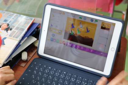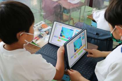 タブレットパソコンでスクラッチというアプリを使い、自分の考えた動きをマスコットにつけていきます。順序立ててプログラミングして行かないと、思い通りの動きになりません。友達と協力してやっている子もいます。