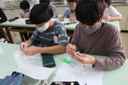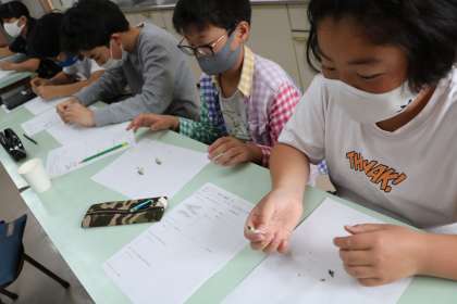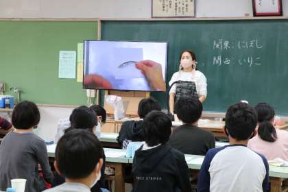 6年生家庭科の授業の様子です。感染症対策の一環として飲食を伴う調理実習はできませんが、今日は実際に煮干しを使いながらみそ汁の出汁のとり方を学習します。煮干しの鰯は捨てるところのない魚です。日本では江戸時代から、出汁として使わない部分の頭・尾・内臓は干鰯という肥料に使われてきました。