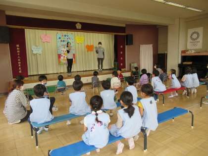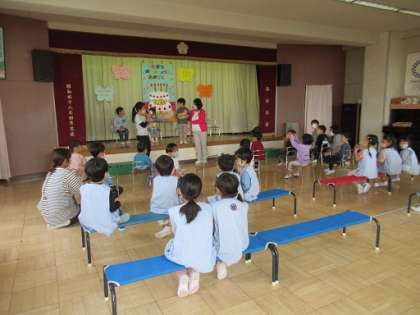 今日は、はな2組ほし2組の4月生まれの皆さんの誕生会でした。園長先生からカードのプレゼントをいただいたり、先生方の出し物を見たりしました。