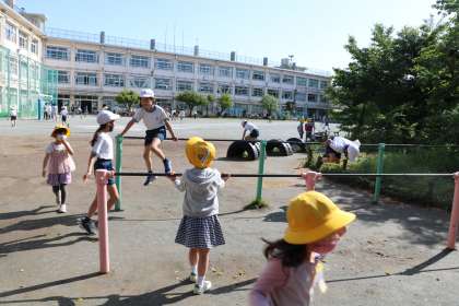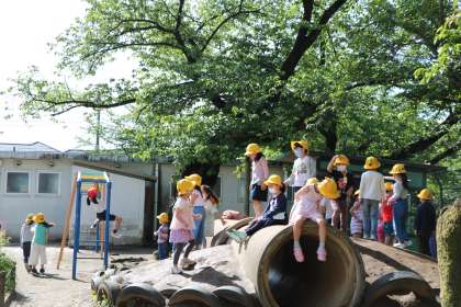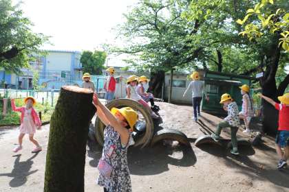 朝遊びの様子です。中が空洞になって危険だったので、途中から切ってしまった八重桜の切り口から、樹液が出ています。1年生の子たちが興味津々で見ています。