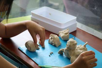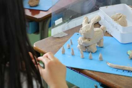 2年生図工の様子です。「ねんどがうごきだす」というタイトルが黒板に書いてありました。自分で考えた生き物、オリジナルの生き物を、大きく作ります。今にも動き出しそうな、鳴き声が聞こえてきそうな動物がたくさんです。