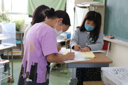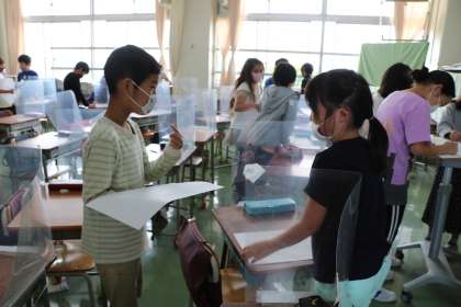 4年生「総合」の様子です。いまみんなが知っていることを出し合い、さらに調べたいことを決めていくこれからの学習の課題づくりに取り組んでいます。友達と意見を交わしたり、タブレットを使って確認したりしながら学習しています。