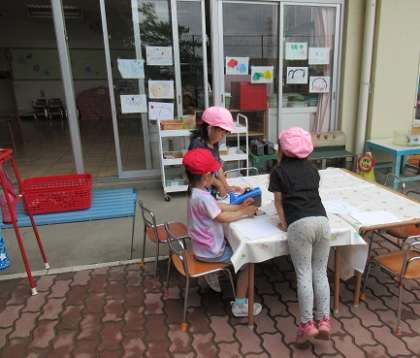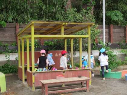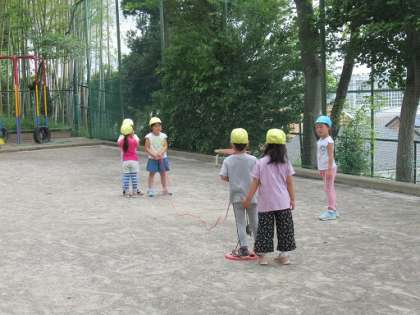 園庭では、年長組さん年少組さん入り交ざって遊ぶ姿が見られます。とてもいいお天気だったので、すぐに外へ遊びに行く子どもたちが多かったです。