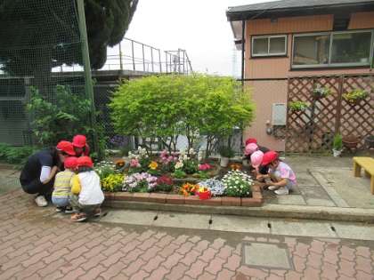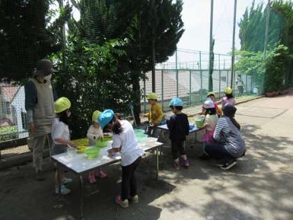 写真は、虫探しや木の実での色水遊びを楽しんでいる場面です。緑がいっぱいで自然に恵まれた砧幼稚園ならではの遊びの姿ですね。