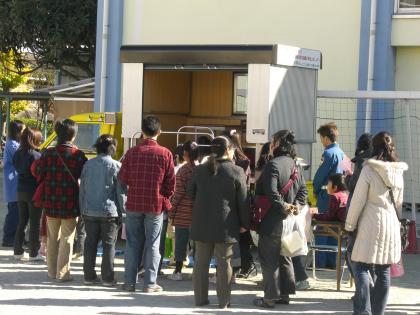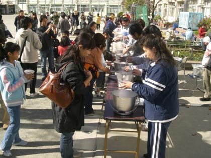 砧小学校避難所運営訓練が行われました。本部長の荒川喜多見上部自治会会長さんを中心に約2時間の訓練が行われました。栗本石井戸会会長、宮崎大蔵住宅自治会会長、加藤大蔵東部町会会長、堤喜多見まちづくり出張所長、竹内砧まちづくり出張所長さんをはじめ約150名が参加されました。体育館で阪神淡路大震災の様子を見た後、町会・自治会ごとに校舎内を見学しました。その後、校庭に出て起震車、トイレ見学、発電機操作などを体験しました。最後は温かい日差しの中で、給食・物資担当が作ったゆかりご飯と給食調理主事が作った豚汁を食べました。参加賞として非常用ビスケット、子どもたちにはサインペンも配布しました。顔見知りになってよかったですね。この人と人との温かい関係が災害時のときに、また日々の生活の中で活かされていきます。