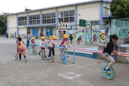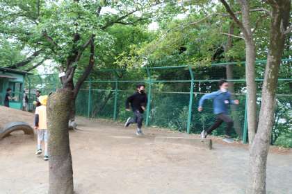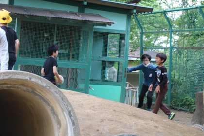 飼育小屋(今は何も飼っていませんが)の陰に隠れている6年生ですが
